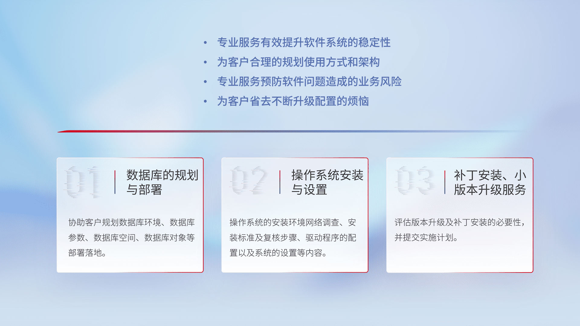 为客户提供软件规模升级、、快速部署、、、、按需配置的专业服务,,,,从数据库的规划与部署到操作系统的安装与设置,,,,再到补丁安装和小版本升级提供支持。。。