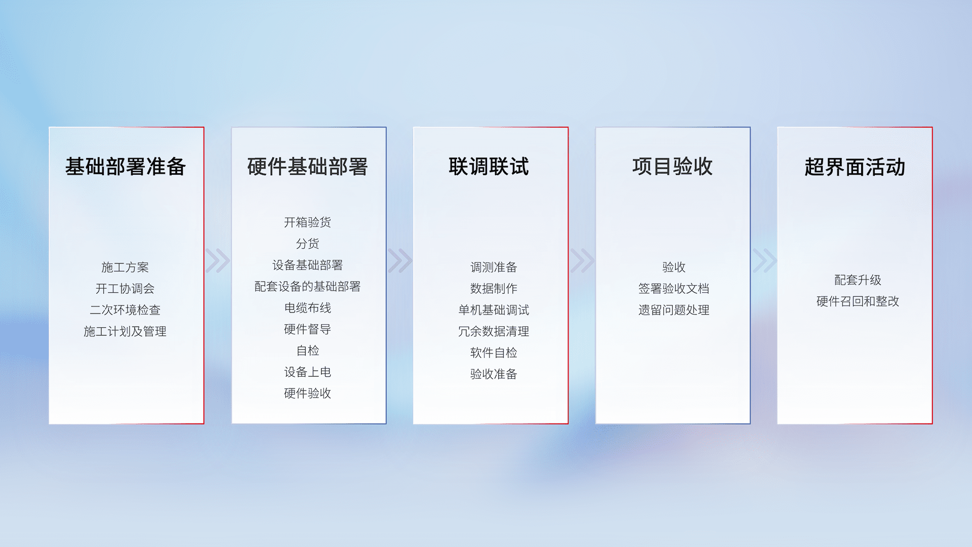 从基础部署准备、、、、硬件基础部署、、、联调联试、、、项目验收、、、越界面活动的全过程可追溯,,,,保证施工质量和进度。。
